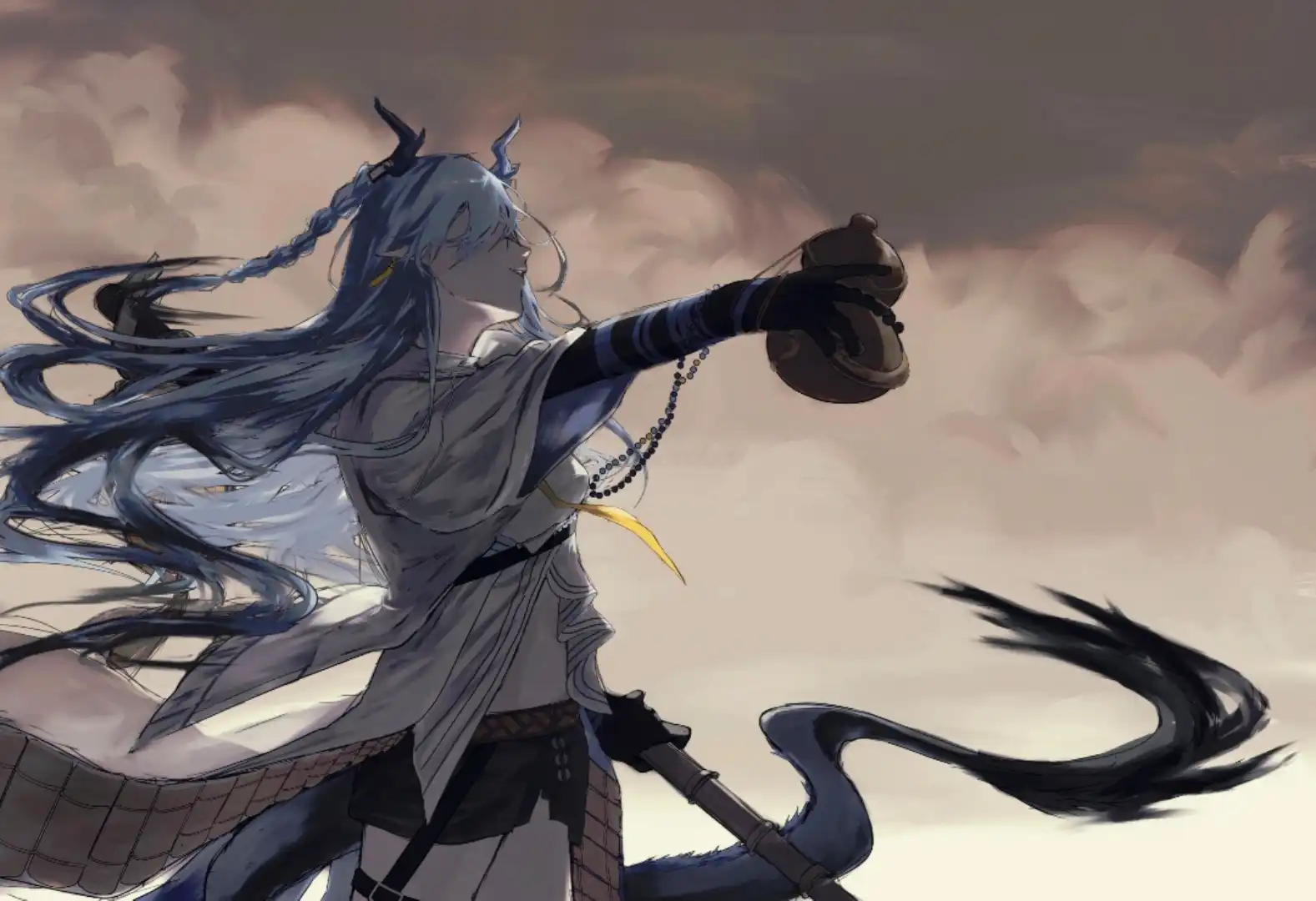 弦惊挥剑斩开一记术法。她将灯杖插在身后,身躯一振,抖去戎装上的沙尘,向前递出一拳。